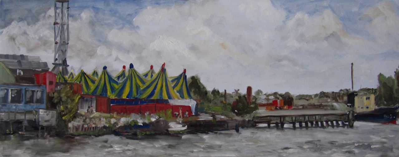Realistisch Olieverf Waterkant Werf Tenten