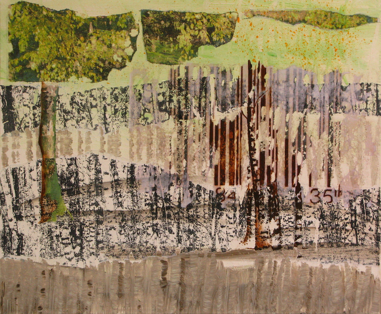 Een veellagig werk op doek (opgespannen) met een berkenbos als uitgangspunt en de streepjescode (van een kunstboek) als eindpunt.