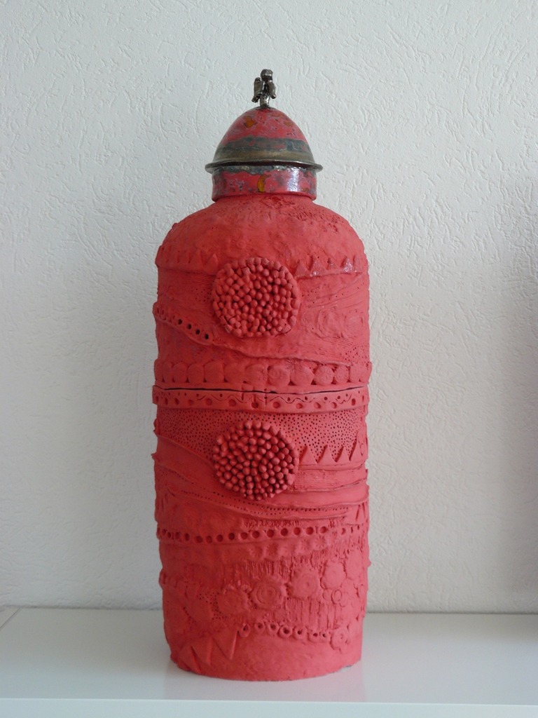Het rode object is hamdgevormd geïnspireerd op mijn reizen door Azië. Het bestaat uit drie delen. De twee onderste vormen zijn geheel bewerkt met kleifiguren.