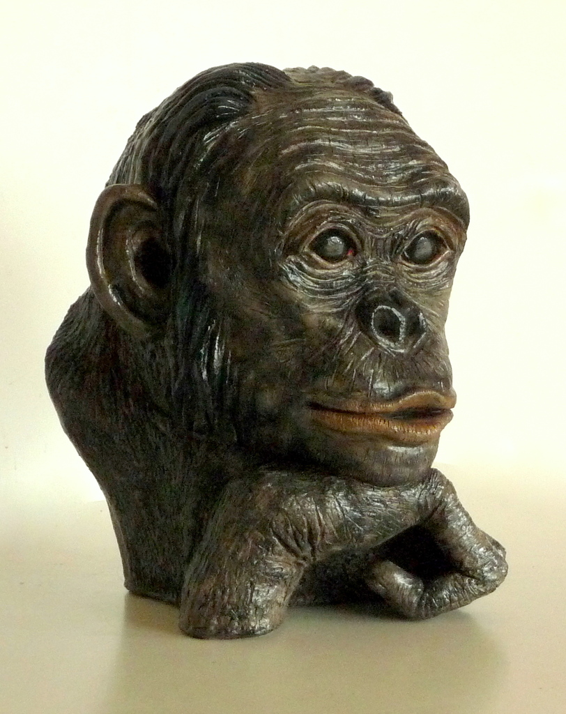handgevormd hoofd van aap (bonobo) van klei, gestookt op 1180°, beschilderd