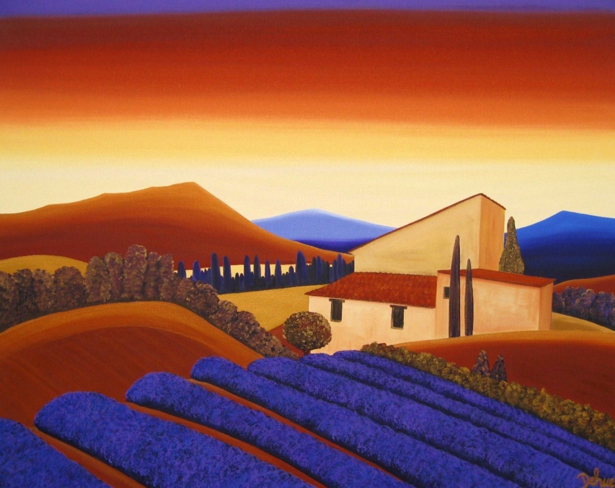 Huis Figuratief Landschap Gold Paars Goud Kleurrijk Frankrijk Natuur Bomen Purple Landscape Warm Boerderij Frans Huizen Sfeervol Roodbruin Okergeel Lavendel France Franse French Lavender