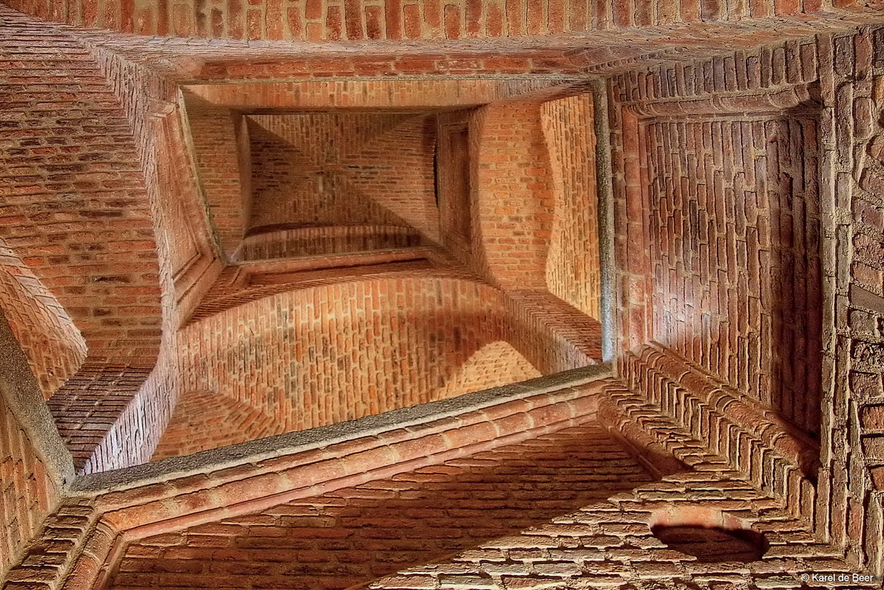 Kasteel Carrouges in Normandië (dept. Orne, Frankrijk) is bekend als 'Château en Briques'. Veel baksteentjes, ook binnenin. Hier is een bijzonder trappenhuis te zien, geheel in baksteen. Deze foto heeft gehangen in Agora Gallery (NYC, 2013) waar men er iets van M.C. Escher in zag. Foto gemaakt in 2012 met Canon 400D. Beschikbaar als fotoprint op dibond, bedekt met plexiglass 3 mm. Beperkte oplage, tot 10 stuks