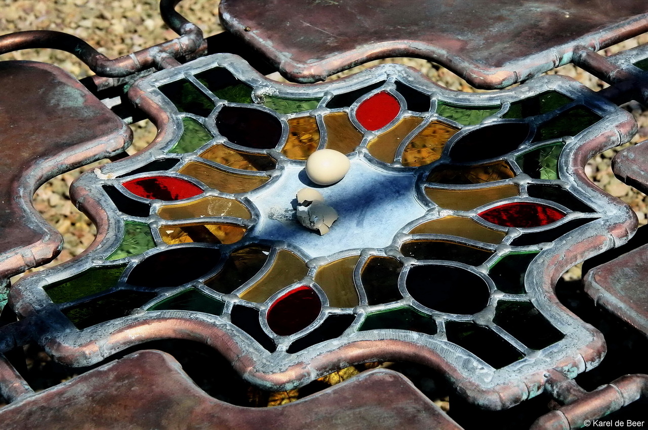 Hoe hard kan een schaduw vallen? Voor een ei al gauw te hard als je dit ziet liggen op een kunstzinnige tuintafel onder een pergola (Interart, Heeswijk-Dinther, 2008). Gemaakt met Canon 400D en beschikbaar als fotoprint op dibond, bedekt met plexiglas 3 mm. Beperkte oplage, tot 10 stuks.
