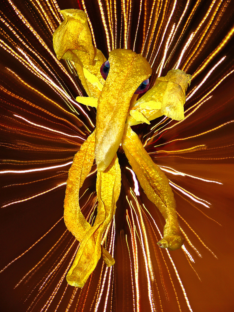 Tulpman Strijdbaar figuur reizend op warp snelheid Samengesteld uit 3 foto's: beweging, stil: nature morte en ogen, samengevoegd tot een snel bewegend buitenaards wezen