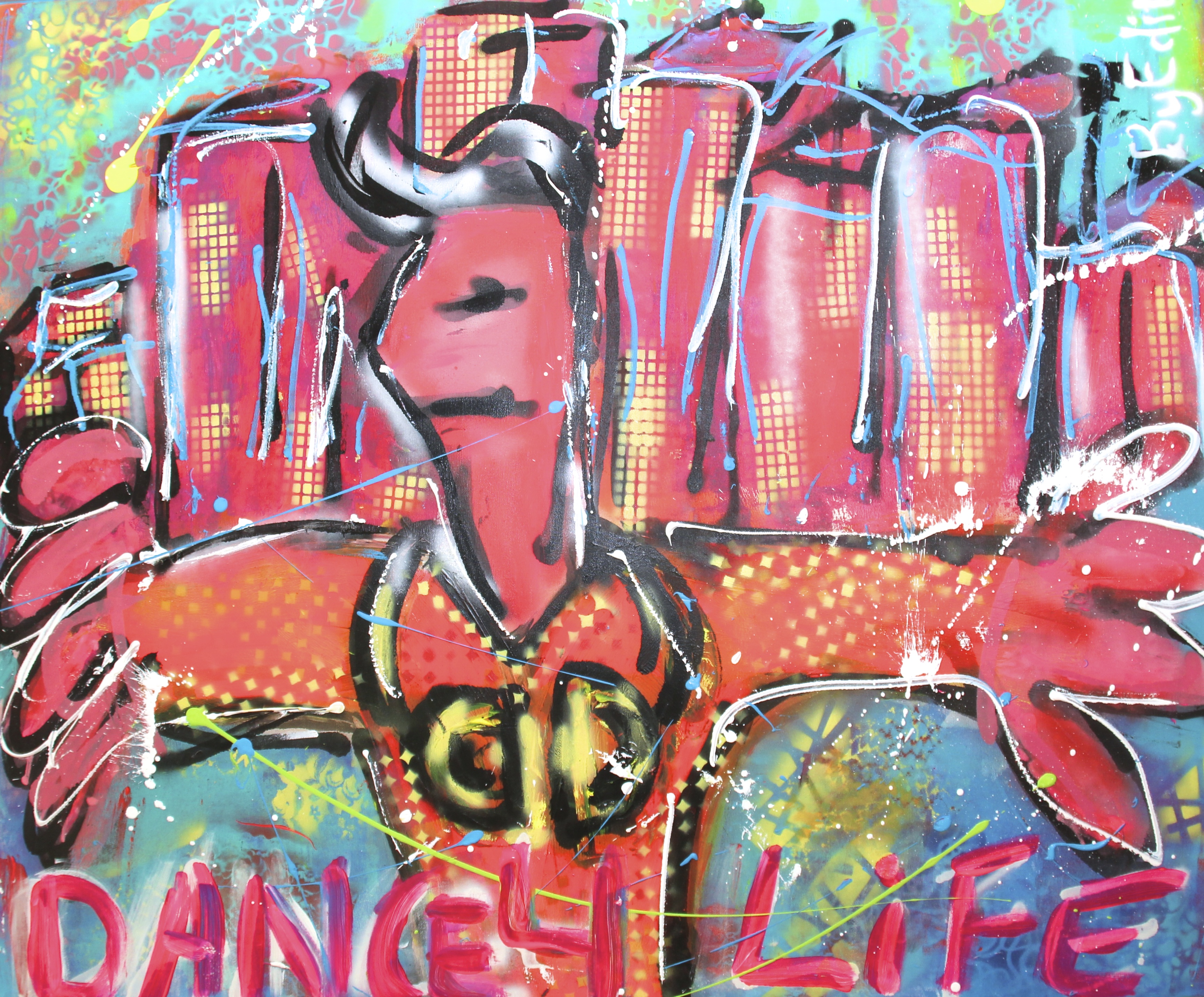 Moderne kunst in Neo-popart stijl geïnspireerd door Herman Brood en Corneille (CoBrA). Met spuitbussen, rollers en mallen van vliegenmeppers tot kanten strings breng ik emotie op het doek. 'Do you dare to feel'