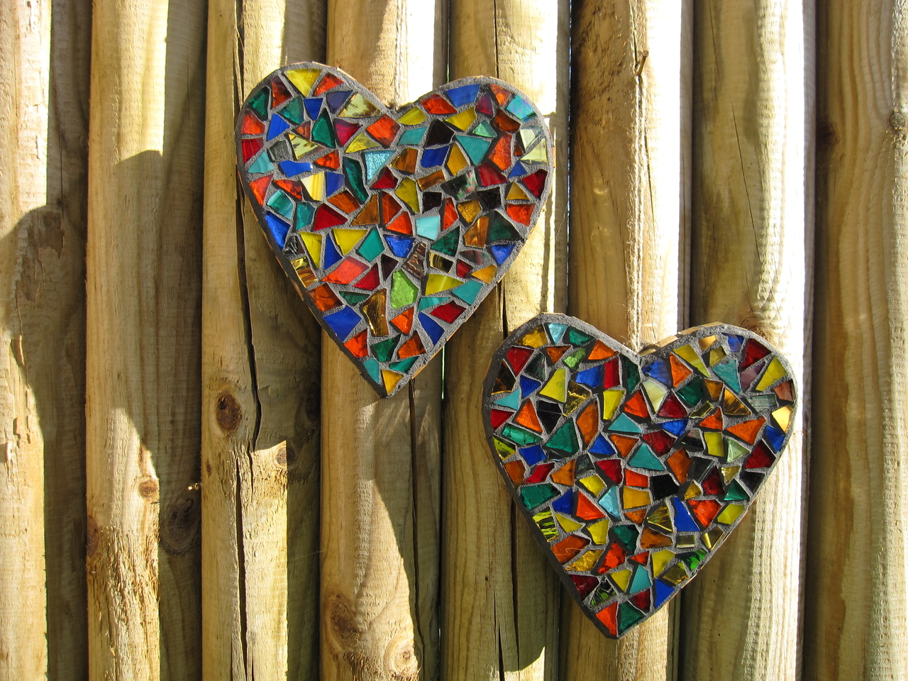 Ondergrond houten hartjes met daarop glasmozaiek.