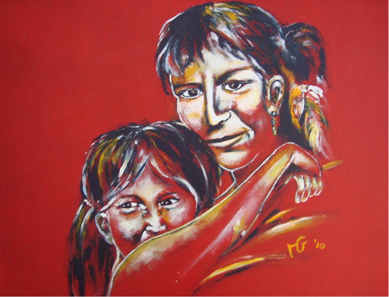 Schilderij, gemaakt n.a.v. een klein (zwart wit) fotootje in de krant. Deze foto sprak me aan. Straalde geluk, geborgenheid uit.