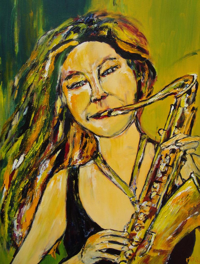 Vrouw met saxofoon, gemaakt tegelijk met 2 andere schilderijen met vrouwen. De achtergrondkleuren lopen in elkaar over, horen bij elkaar, maar komen apart ook goed tot hun recht. Met blank houten baklijst.