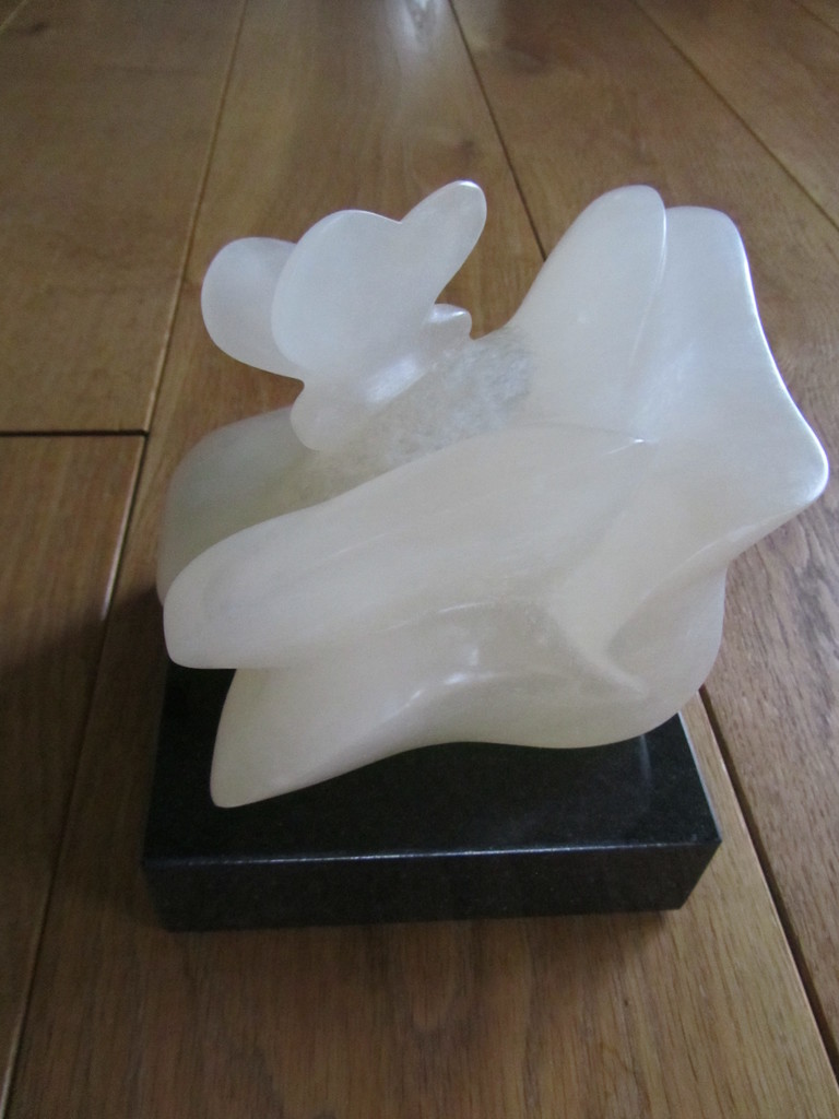 Een bloem met vlinder uit albast.