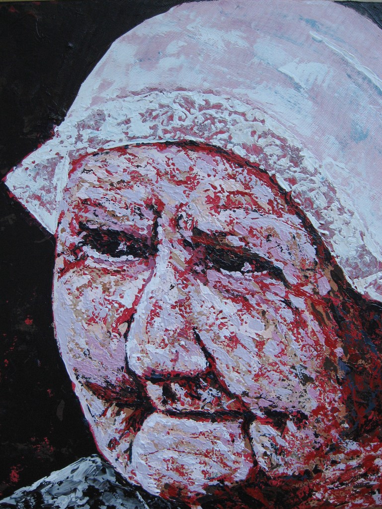 De oude boerin ziet iets aan haar rechterkant. De oude boer? De boerin is geschilderd met een palletmes. Onder het geschilderde mutsje zit een stuk vitrage en het gezicht krijgt een gerimpelde structuur door de onder de verf aangebracht opgeruwde gesso.