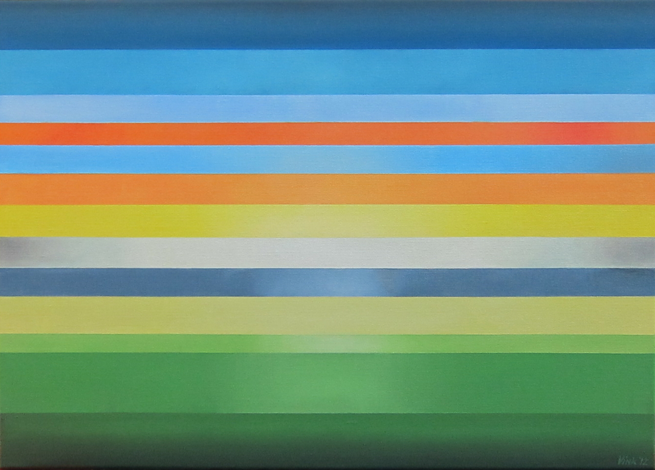 Compositie in verschillende kleuren. De zijkanten van het doek (linnen) zijn ook beschilderd.