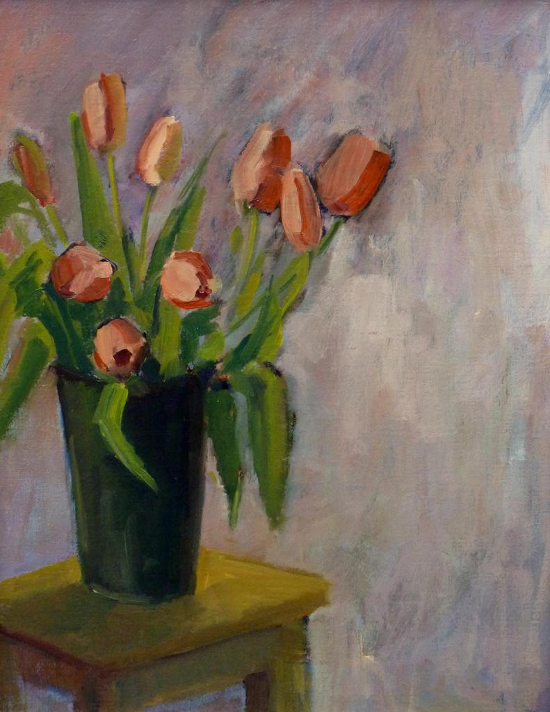 Vaas met tulpen op plantentafel, geschilderd in olieverf op linnen.