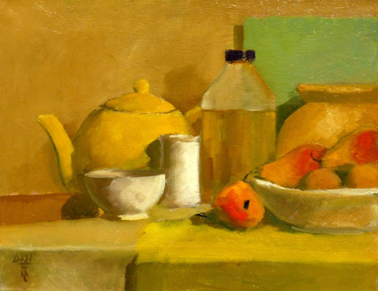 Geel Theepot Fles Fruit Tafel Realistisch Olieverf Linnen
