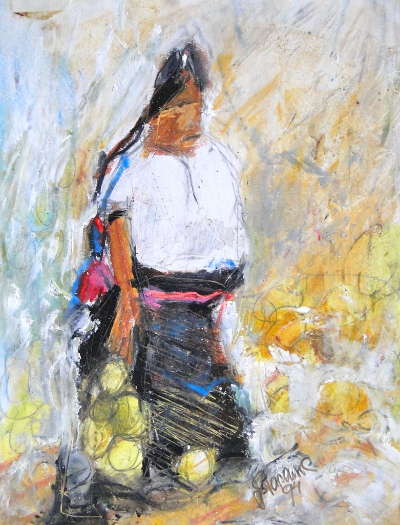 Het meest opvallende in de schilderijen van Joke Stapensea is haar kleurgebruik, licht-donker contrast, kleurcontrast en haar krachtige expressieve monumentale vormen.