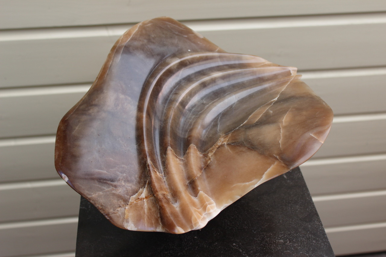 abstracte vorm, donker albast op voetje van belgisch hardsteen. Geinspireerd op de voim en kleur van een blad in de herfst Binnenbeeld