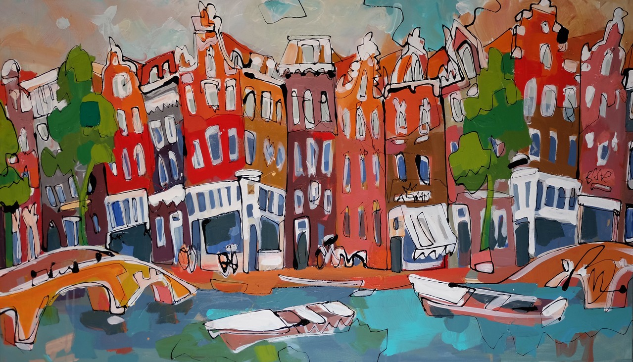 Heerlijke basale weergave van onze hoofdstad; Amsterdam. De gevels zijn bij elkaargeraapte fraaie weergaves her en der langs de grachten geplukt. Het complete gezicht van grachtenpandjes, bruggetjes, bootjes, fietsen en groen. verkocht