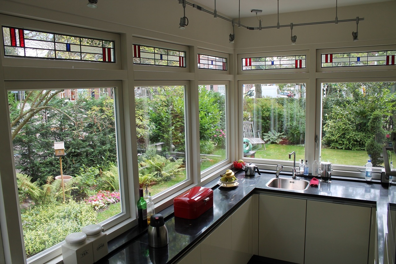 Het herhalende ritme van het motief in de stijl van de Amsterdamse school geeft iets bijzonders aan de nieuw aangebouwde keuken