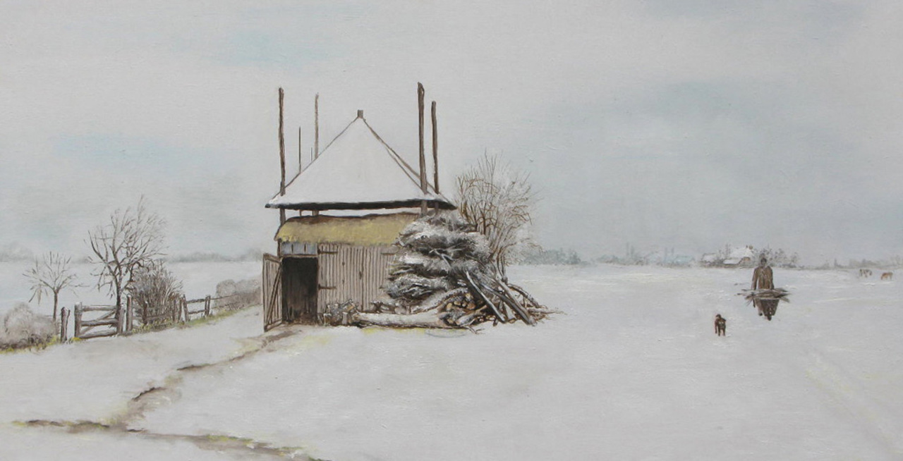 In het winterse landschap brengt een boer wat hout naar de hooischuur.