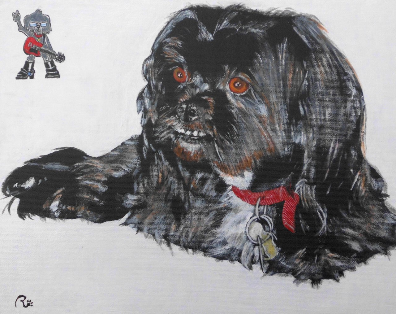 Portret van Joe, het hondje van Bruce Kulick, lange tijd lead guitarist van de beroemde rockgroep, KISS.