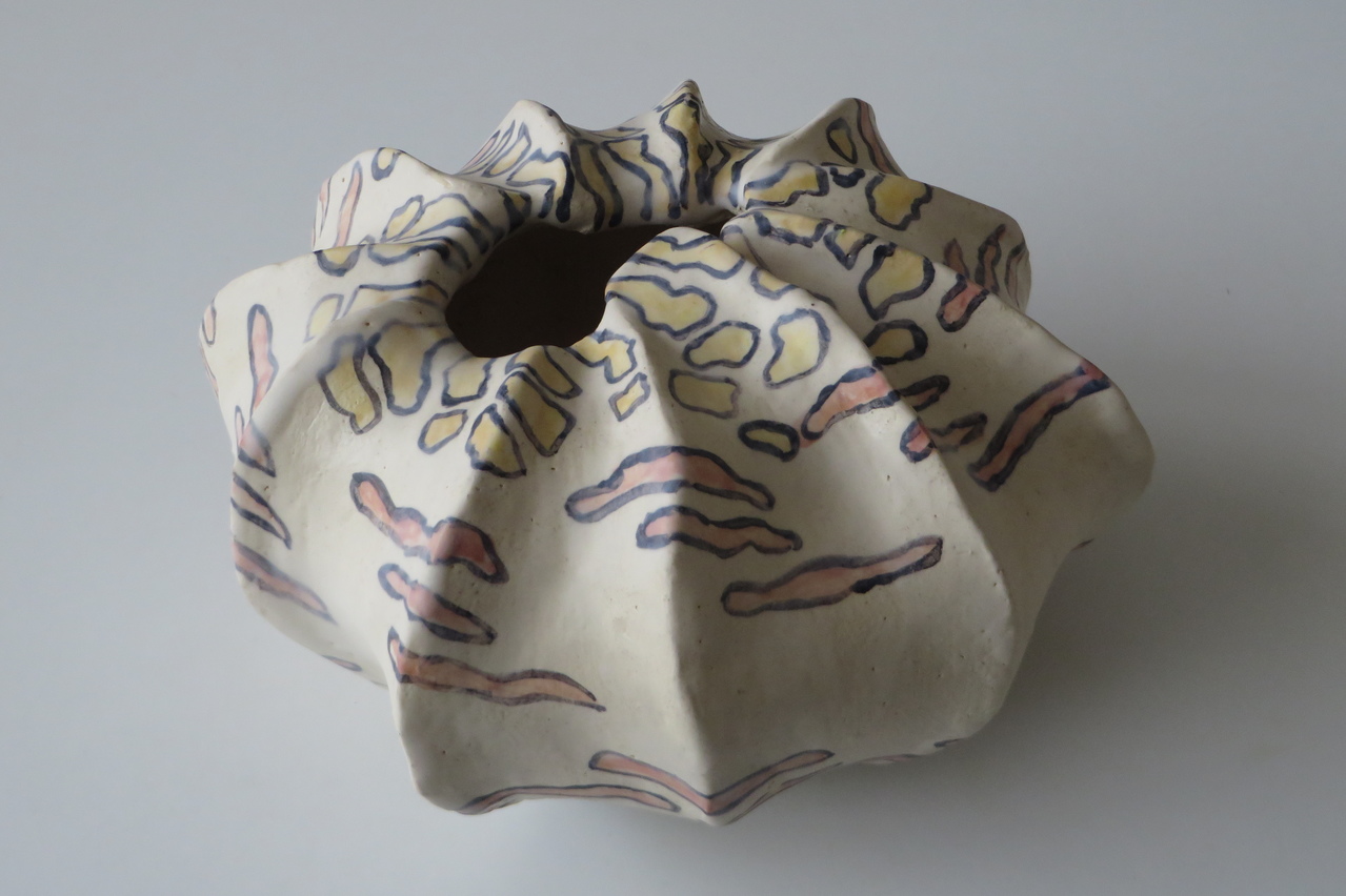 schelp, beschilderd met engobe, met transparant glazuur gestookt op 1050.