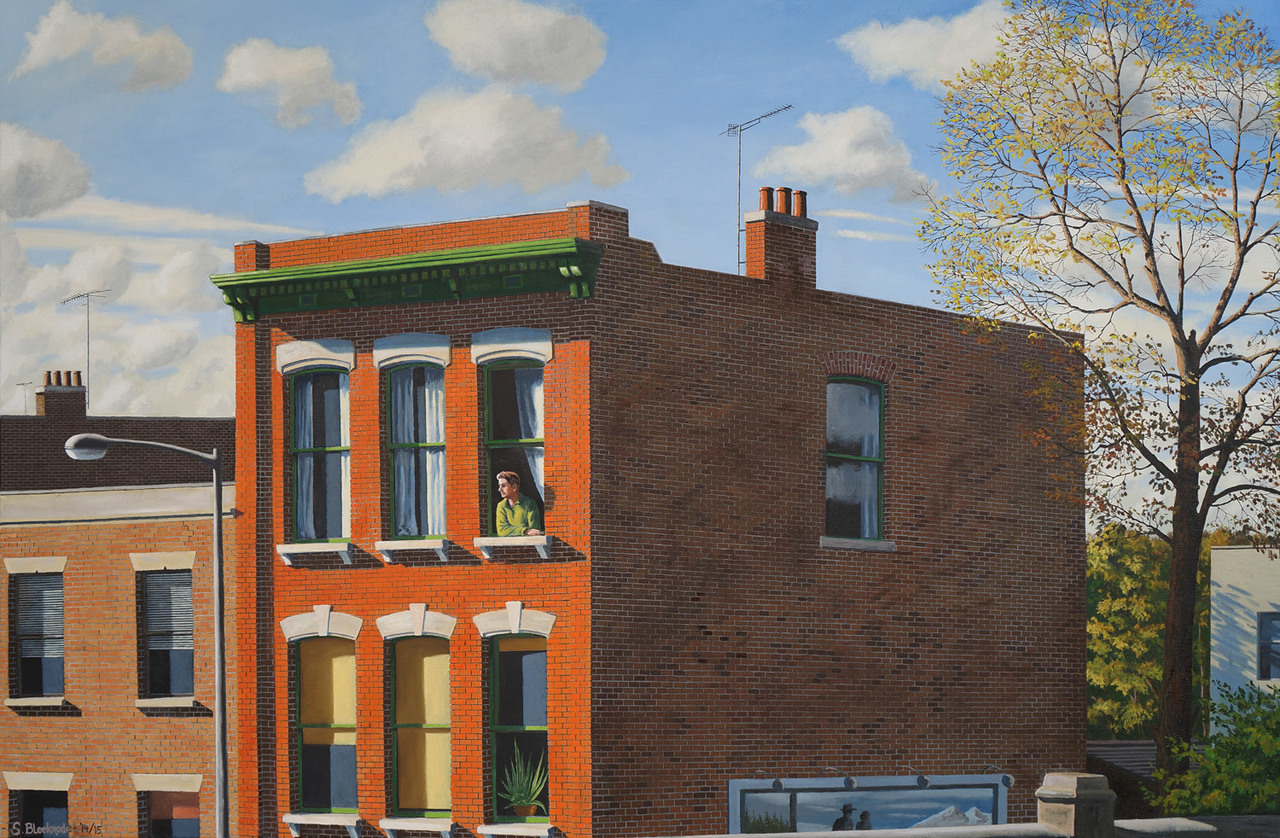 Huis Schilderij Rood Blauw Bruin Blue Oil Olieverf Painting Red Herfst Boom Autumn Brown Realisme Realism Tree Stad House City Realistic Fall