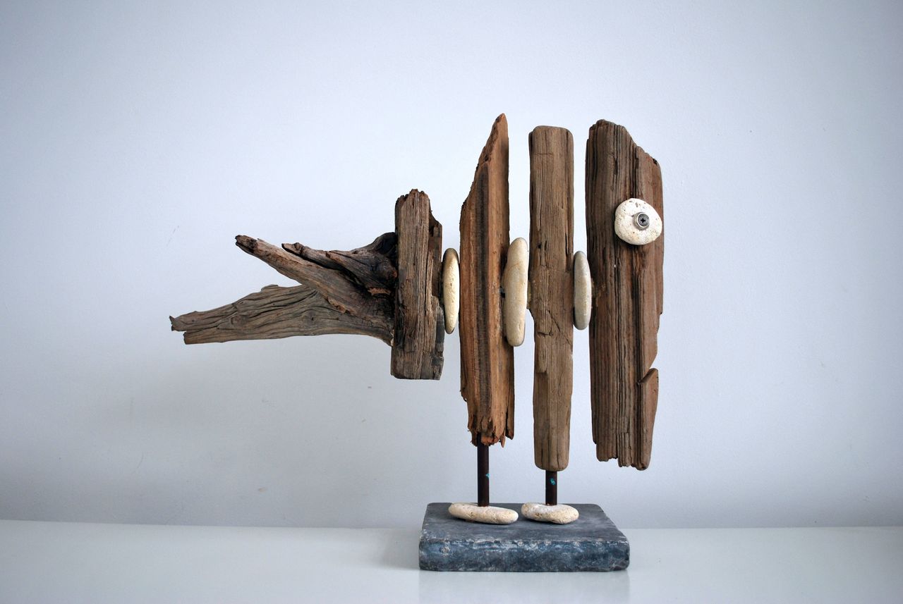 maakt al jaren houten beelden door natuurlijke objecten uit zee te koppelen. De beelden zijn ruw en puur.