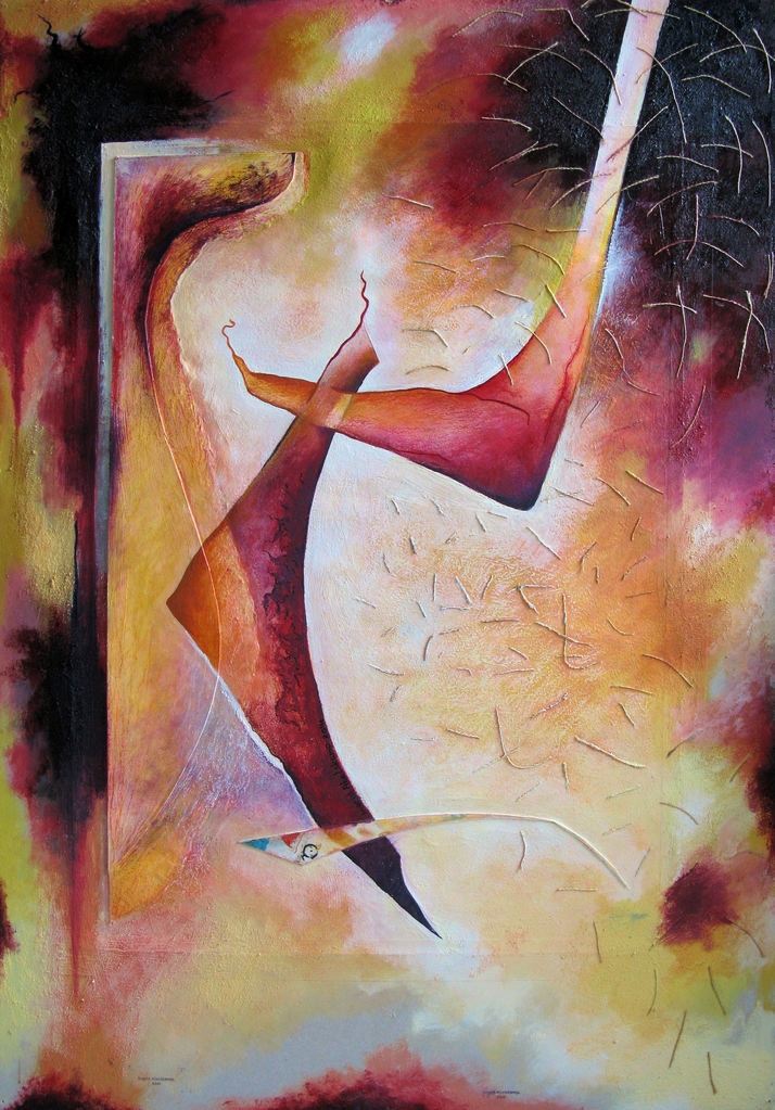 Vanuit oud werk, ruimtelijk, ruimte geven en ruimte ontvangen, energie, gevoelsmatig, intuitief, warm, zonnig, gelaagd, met structuur en bewegelijkheid.