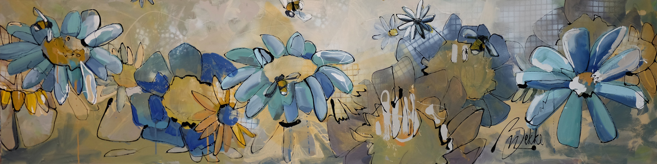 Met zwierige lijnen, grove penseelstreken en ferme toetsen is dit uitgestrekte bloemtafereel op het doek gezet. Zachte tinten worden vergezeld van zonnige geel en hemelse blauwen. Her en der zoemt een vriendelijk bijtje. Een liefelijk tafereel dat op is gebouwd met stoere materialen. 840euro
