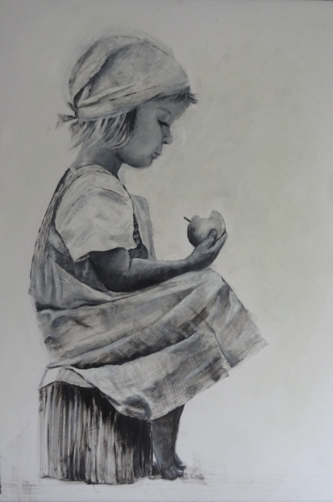 Meisje met appel Dry Brush techniek (tekenen met olieverf.)