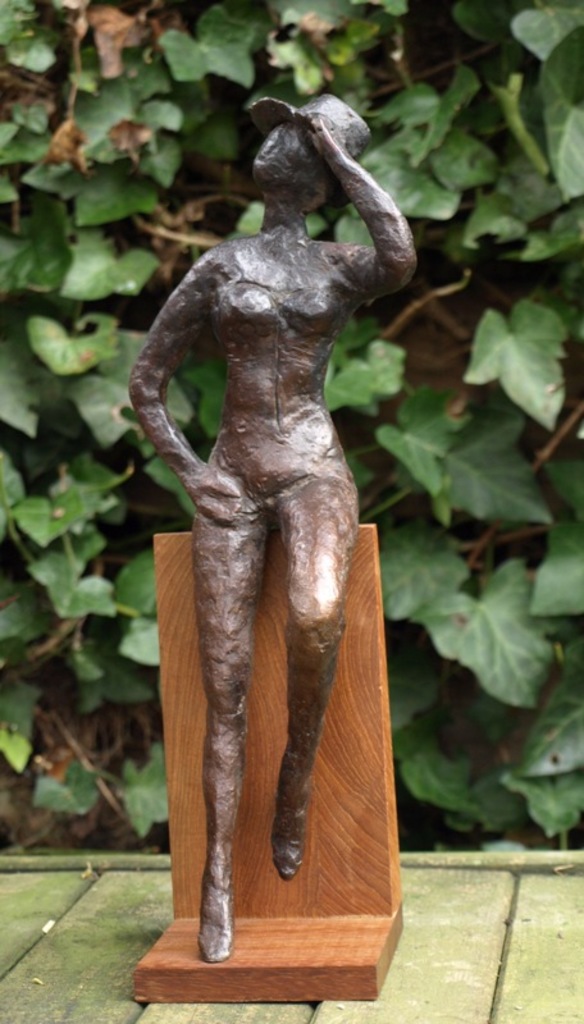 Dame met korseletpakje en hoed, klaar om op te treden. Brons vanuit was.