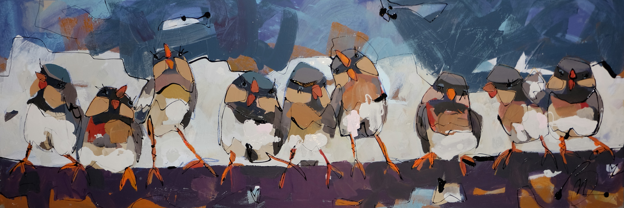HiHoHees geeft een ritme van vogels, lucht, lijn en vrolijke klanken. Het schilderij is krachtig door de extreme kleurcontrasten van donkerblauw, grijs, wit, zwart en de warme detailkleuren van snavel en poten. Een gezellige bende vult het doek. 920euro