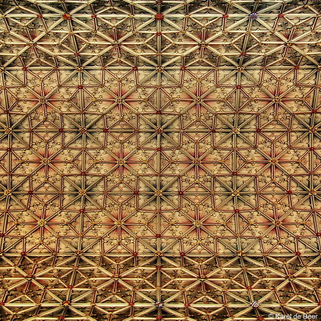 Met de lens recht omhoog is hier het middenstuk vastgelegd van het rijk gedecoreerde tongewelf van de kapittelzaal van de kathedraal van Canterbury (UK, Kent). Compositie uit 2009, gemaakt met een Canon 400D.