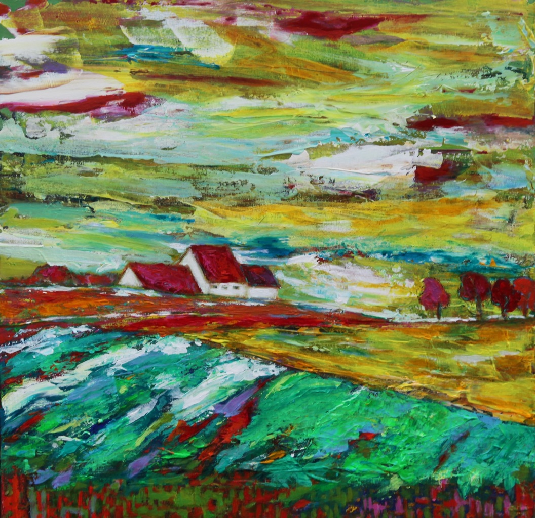 Reisimpressie op een vrije, bijna intuÍtieve manier op doek gezet