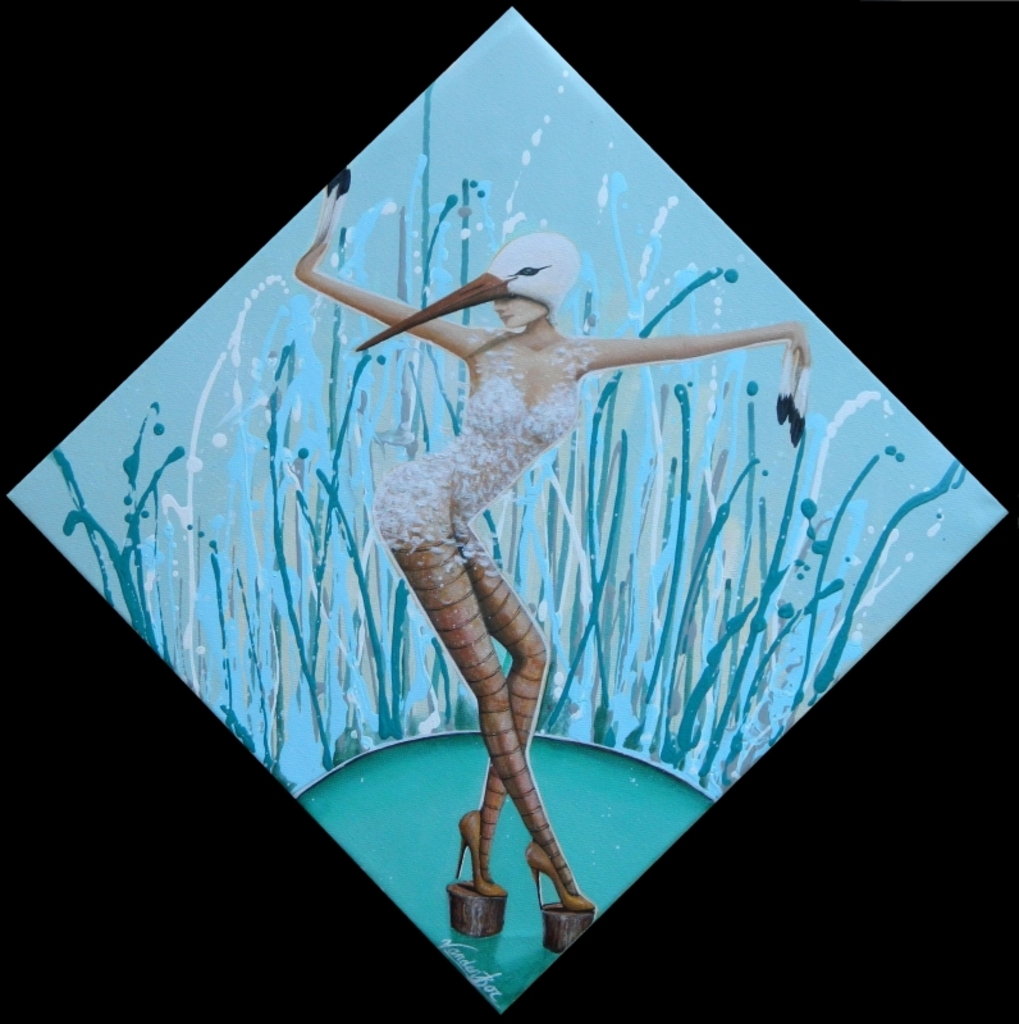 Sold Klein schilderij van een vogelvrouw (ooievaar) tegen een blauw-groene achtergrond. Gemengde techniek. Afmeting: 40 x 40 cm.