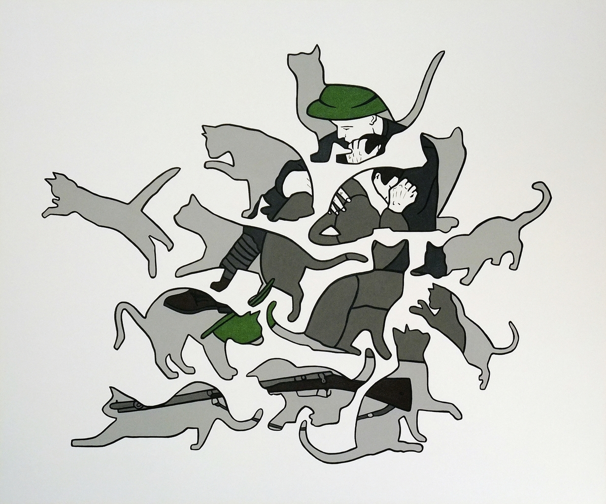 Dit werk heeft de publieksprijs gewonnen in 2013. Het werd speciaal voor de stad Ieper gemaakt (Kunstketting “Een schilderij voor Ieper”). De kattensilhouetten verwijzen naar Ieper als kattenstad (de kattenstoet en het kattenwerpen). Het tafereel dat verscholen zit in deze kattensilhouetten verwijst naar de rol van Ieper tijdens de Eerste Wereldoorlog. Het stelt een wenende soldaat voor die getroost wordt door een andere soldaat. ‘Verdriet’ en ‘troost’ zijn universele thema’s en zijn van alle tijden. Daarmee is de link gelegd naar het heden. De titel van het werk verwijst niet alleen naar de soldaat die zijn goed hart toont door een troostende schouder aan te bieden en naar het treurende hart van zijn kameraad. Het is ook een oud synoniem voor “combat fatigue” of “shell shock”. Termen die misschien beter gekend zijn als “posttraumatische stressstoornis”, een psychiatrisch ziektebeeld waar soldaten mee te kampen hebben, toen en nu. Acryl op 3D-doek