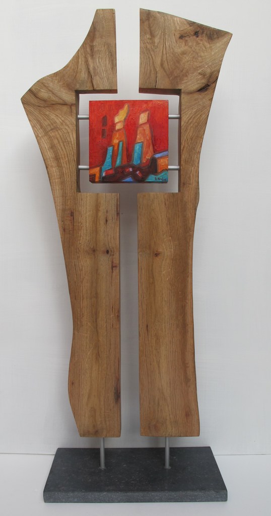 Nieuw project met werken die in een schijf van een boom zijn gemonteerd en op een hardstenen voetje zijn geplaatst. De werken zijn rondom beschilderd, waardoor je ze van verschillende kanten kunt bekijken.