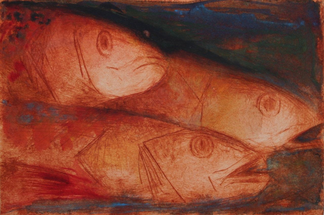 Drie vissen, met aquarel bewerkt.