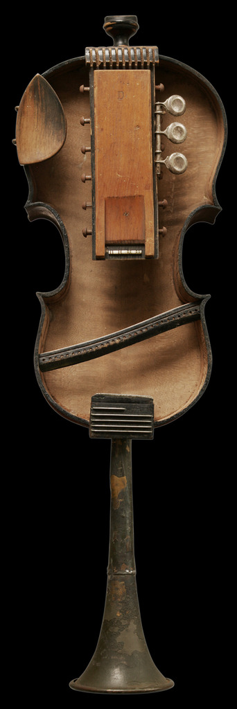 Assemblage met viool, hout en metaal
