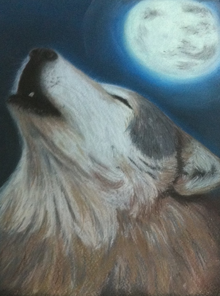huilende wolf gemaakt met rembrandt soft pastel, met ruige rand eromheen ,achter glas