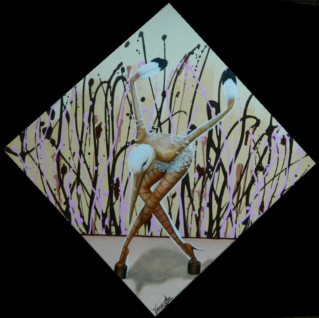 Sold A little bow is een klein schilderij van een vogelvrouw (ooievaar) die voorover buigt tegen een bruin/zalmroze/roze achtergrond. Afmeting 40 x 40 cm.