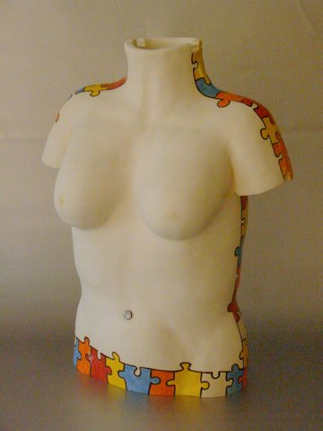 uit ringen opgebouwd, gedecoreerd met engobe en glazuur. in de navel een kunststof diamant