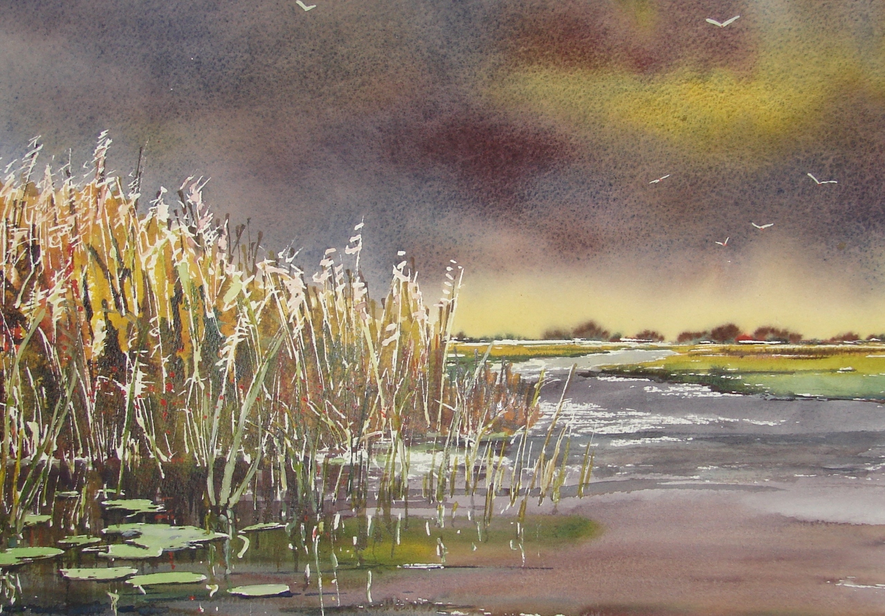 Realistische aquarellen en olieverf schilderijen van Hollands landschap, met altijd expressieve luchten boven de lage horizon zich spiegelend in de waterrijke polder. Ook werken uit de Franse Morvan en van de Oostelijke Algarve in Portugal.