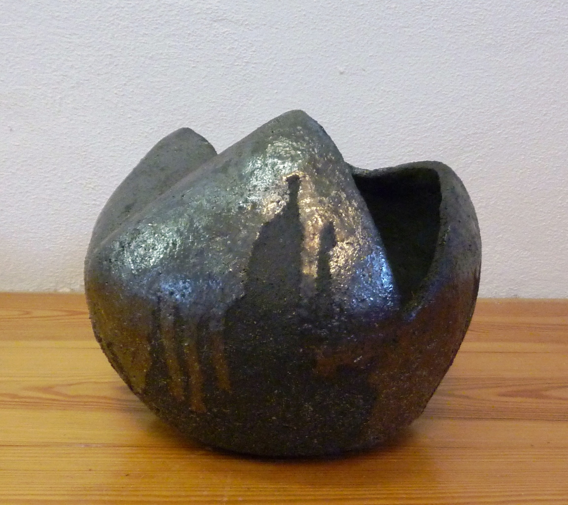 pot van zwarte grove klei gedeeltelijk met bronsglazuur overgoten