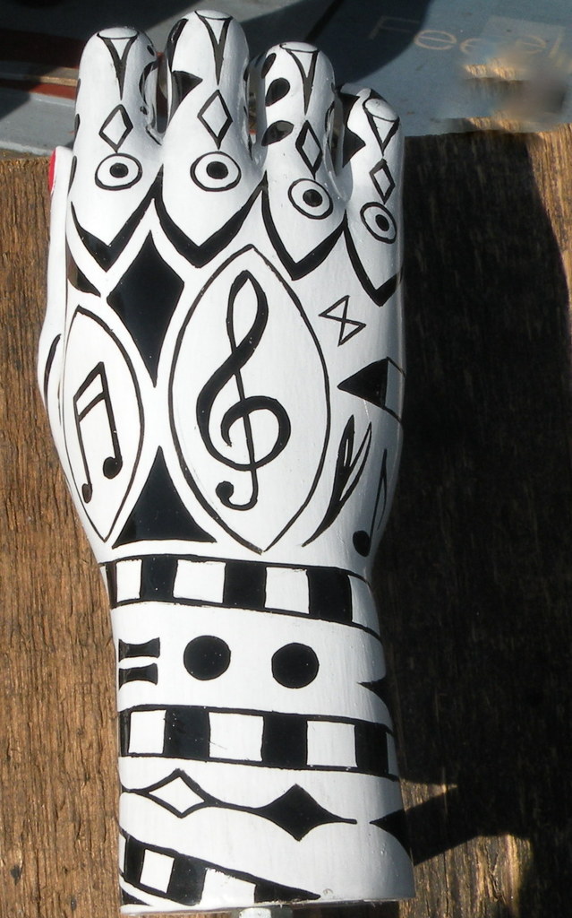 Zwart - wit beschilderde hand met muziekmotieven.