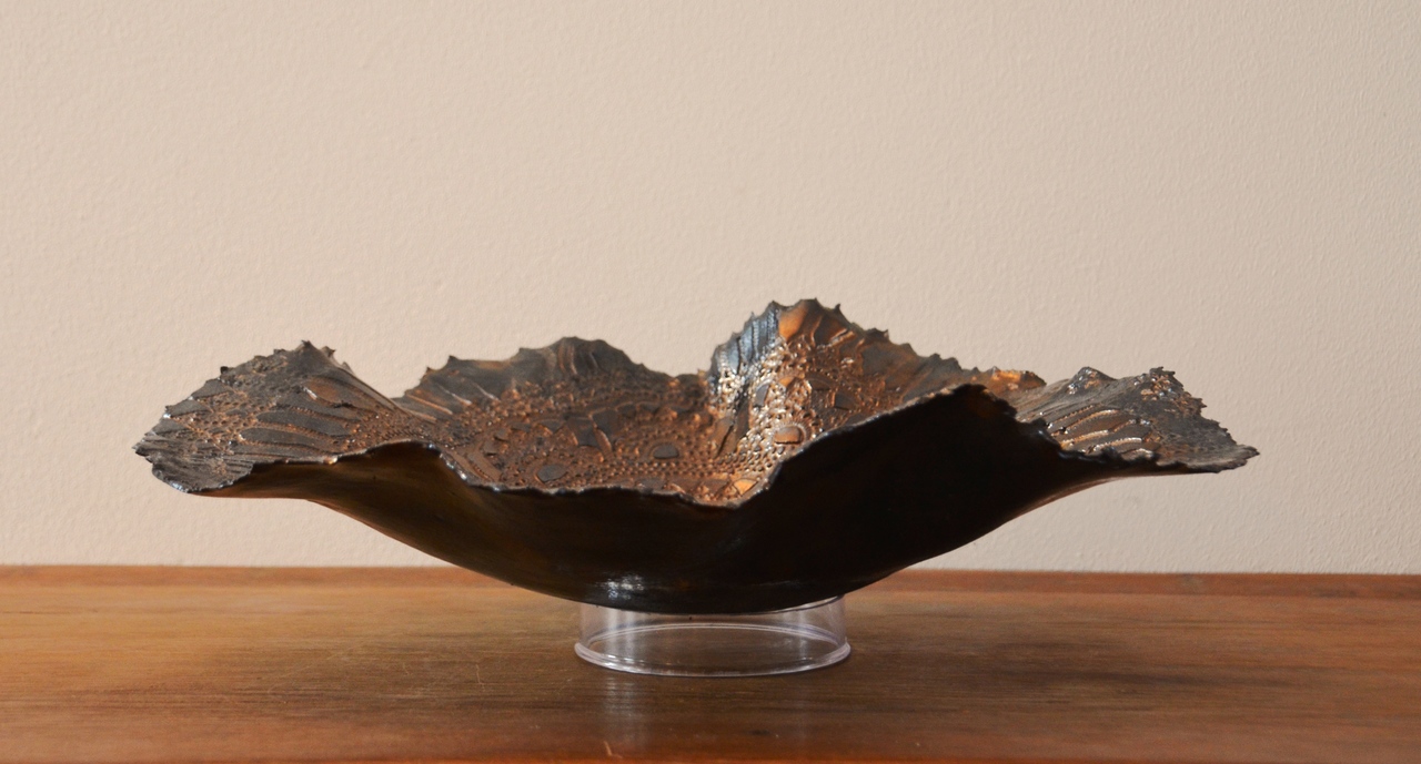 schaal van zwarte klei met kantmotief, bronskleurig glazuur op perspex voet