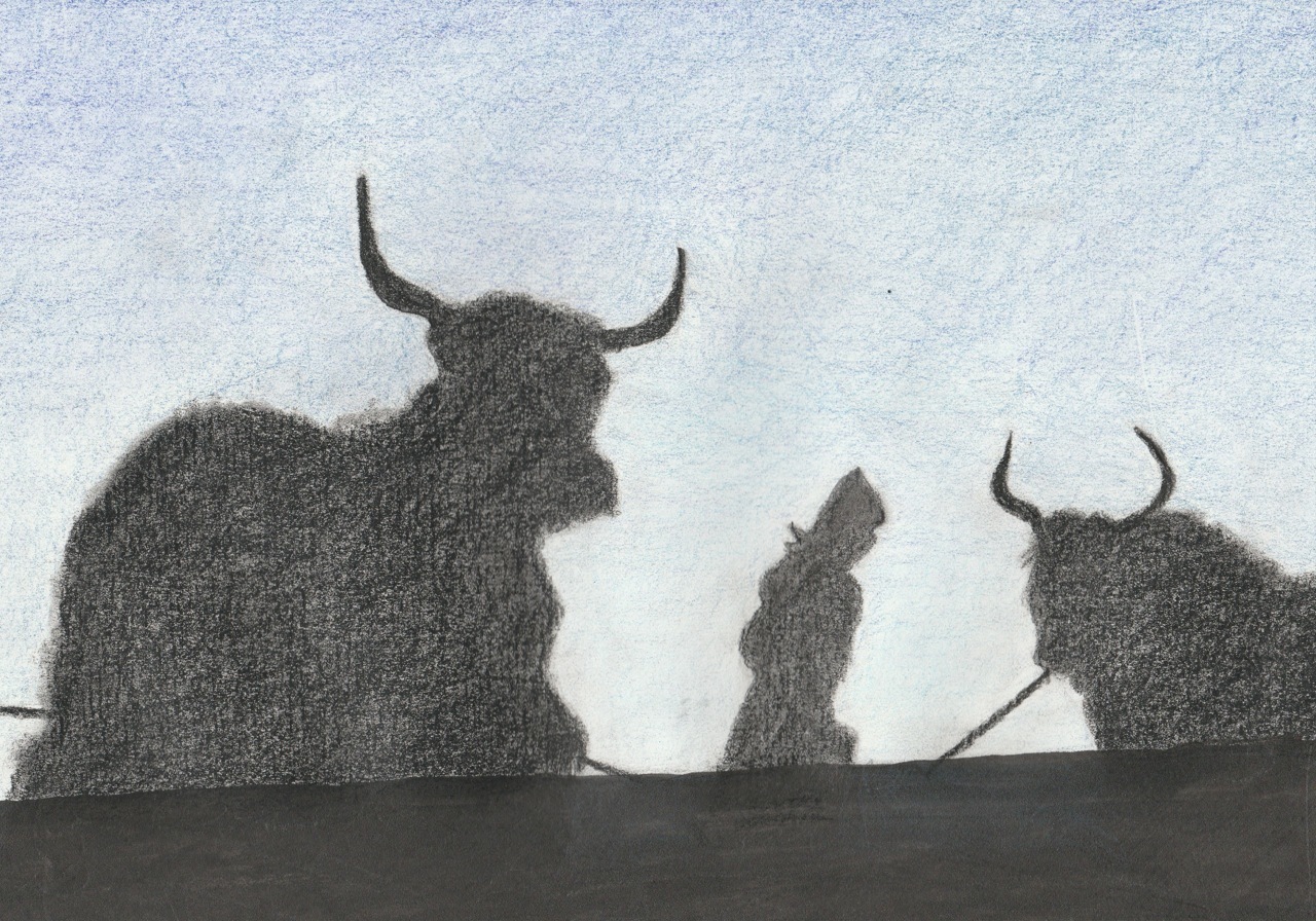 Tekening in pen en potlood, in de serie Tibet, over Yama en Locho, nomaden in het Himalaya gebergte in Tibet.