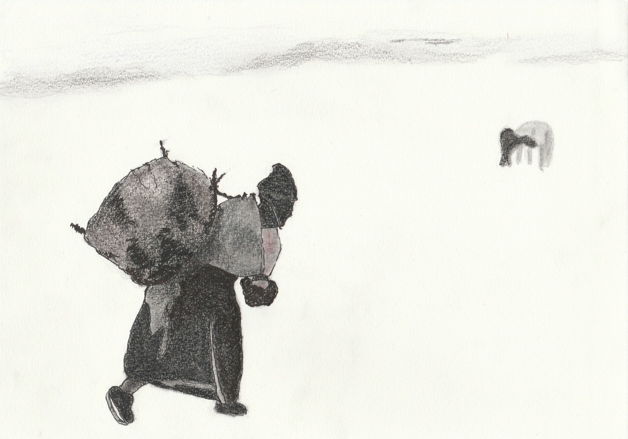 Tekening in pen en potlood, in de serie Tibet, over Yama en Locho, nomaden in het Himalaya gebergte in Tibet.