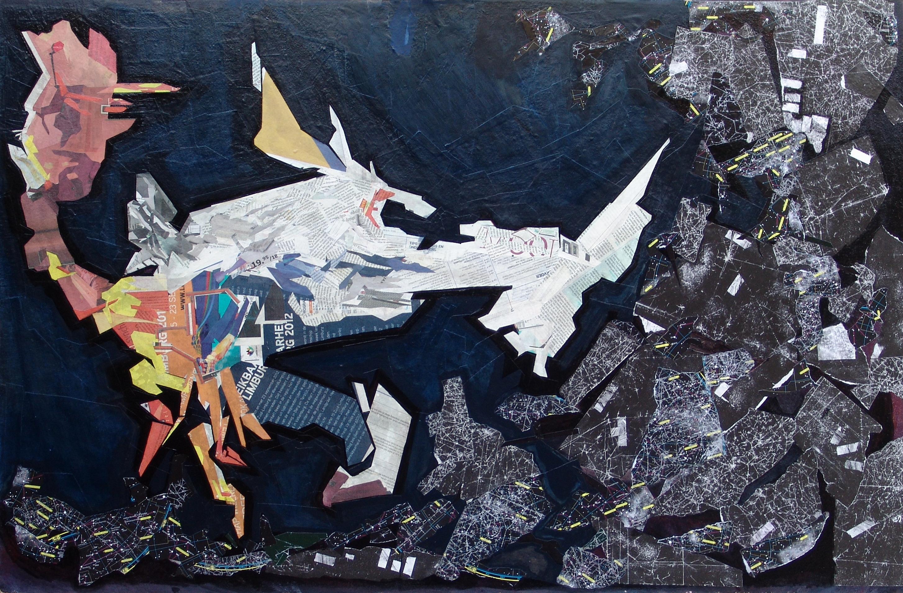 Het werk is een collage van nieuws, reclames, sterrekaarten en pakpapier.