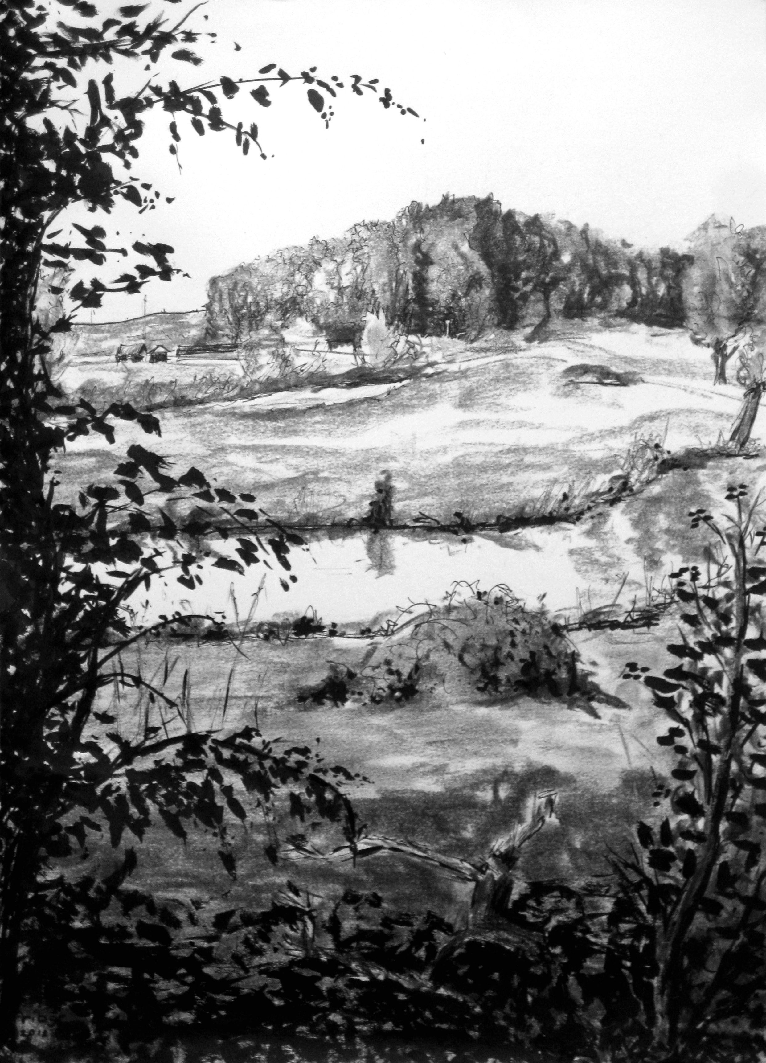 Doorkijkje vanaf de Velderberg - zicht op de meanderende Regge bij Hankate (plein-air-tekening)