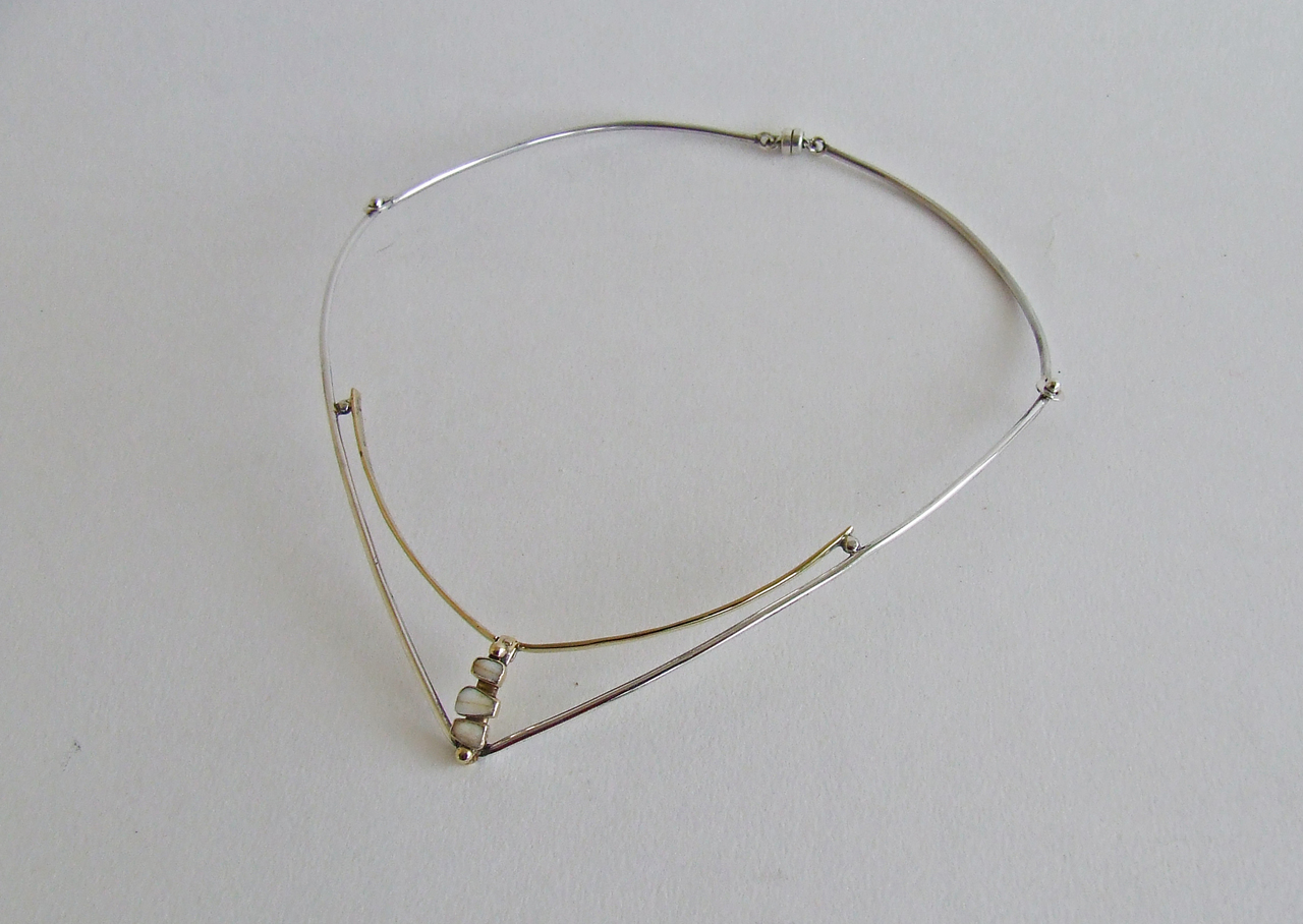 Halssieraad van rond draadmateriaal, twee aangeleverde gouden trouwringen en een gouden ring met kindertandjes. De trouwringen zijn doorgezaagd en uitgerold, zodat de inscriptie zichtbaar blijft. Een deel van de ring met kindertandjes is opgehangen tussen de beide ringen en de zilveren band. Het geheel is hoogglans gepolijst. (ontwerpopdracht S1169)